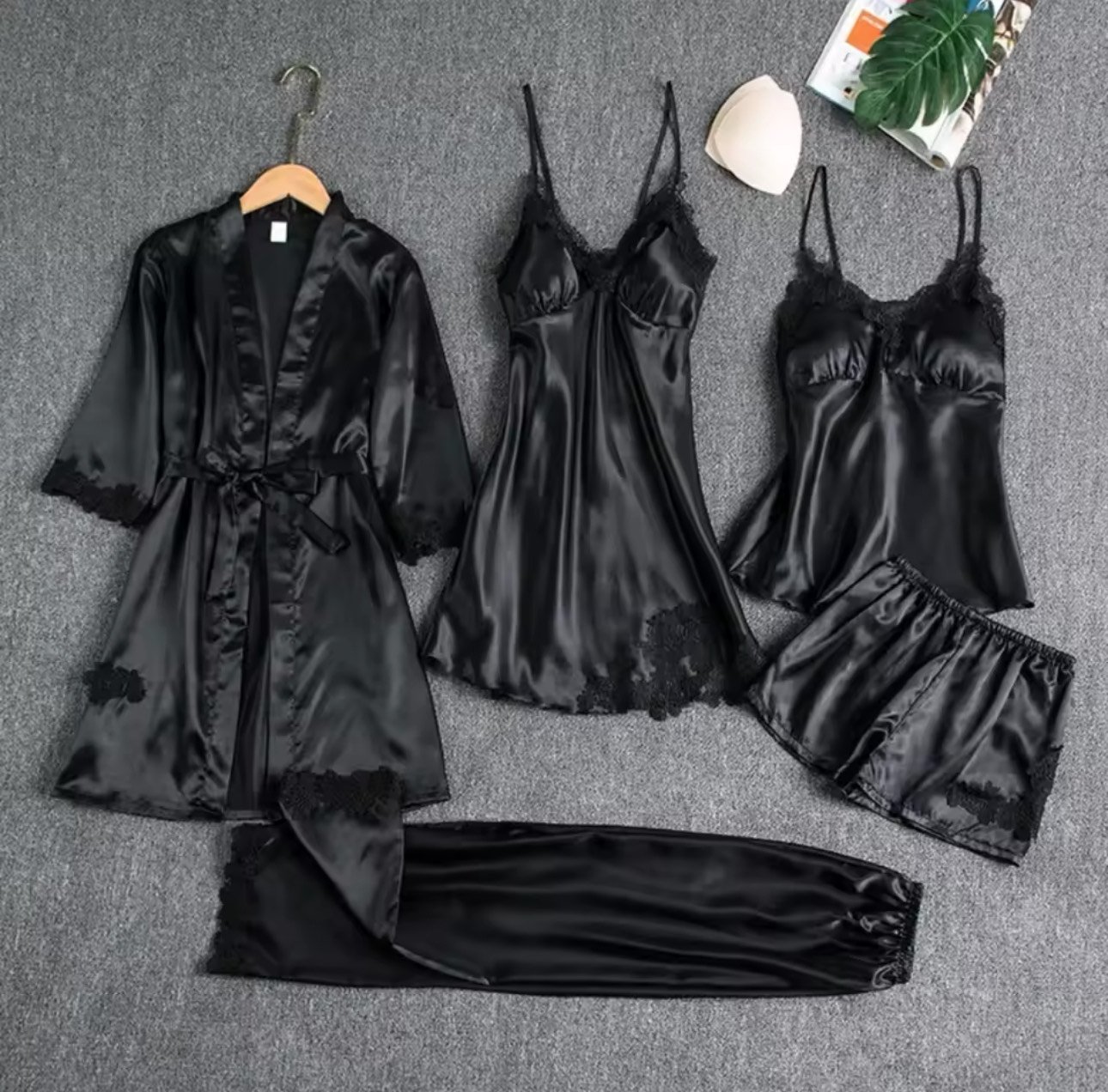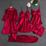 5pc Silk robe sleep suit women's lace pajamas gown set v-neck cami nighties wear
